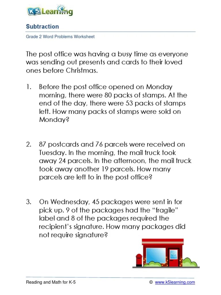 Grade 2 Subtraction Word Problem Worksheets 1 3 Digits K5 Learning